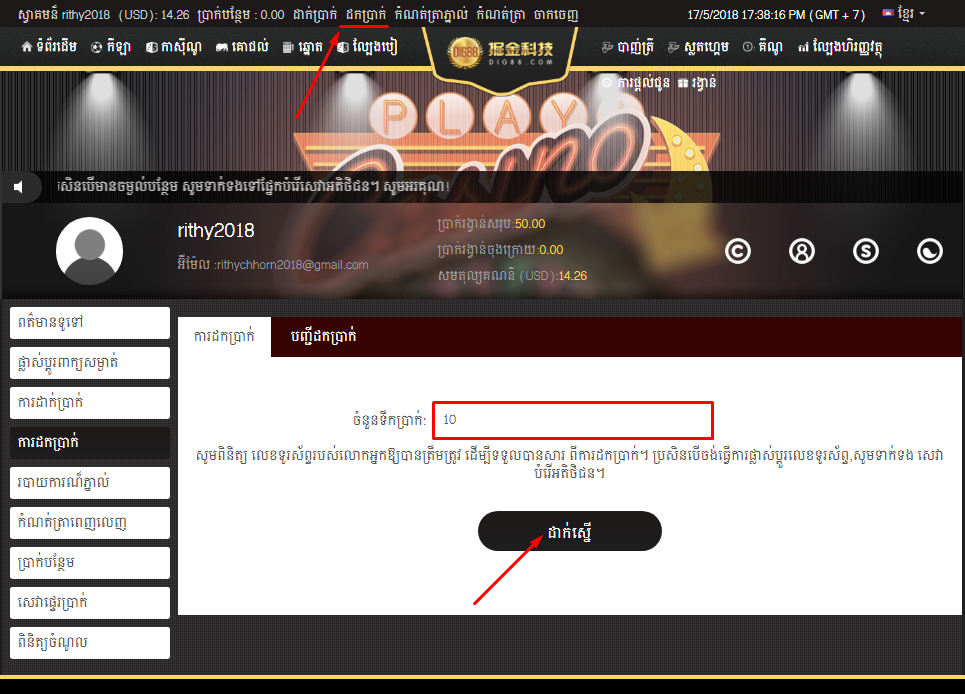 ប្រសិនបើអ្នកមានបំណងចង់ដកប្រាក់ត្រលប់ទៅគណនីធនាគាររបស់អ្នកវិញ គឺទាល់តែនៅក្នុងគណនីធនាគររបស់អ្នកមានចំនួនទឹកប្រាក់គ្រប់គ្រាន់ និងគោរពតាមលក្ខខណ្ឌរបស់ DIG88 បានកំណត់ជូនជាមុនសិន មុននឹងលោកអ្នកធ្វើការដកប្រាក់ជាមួយនឹងយើងខ្ញុំ។